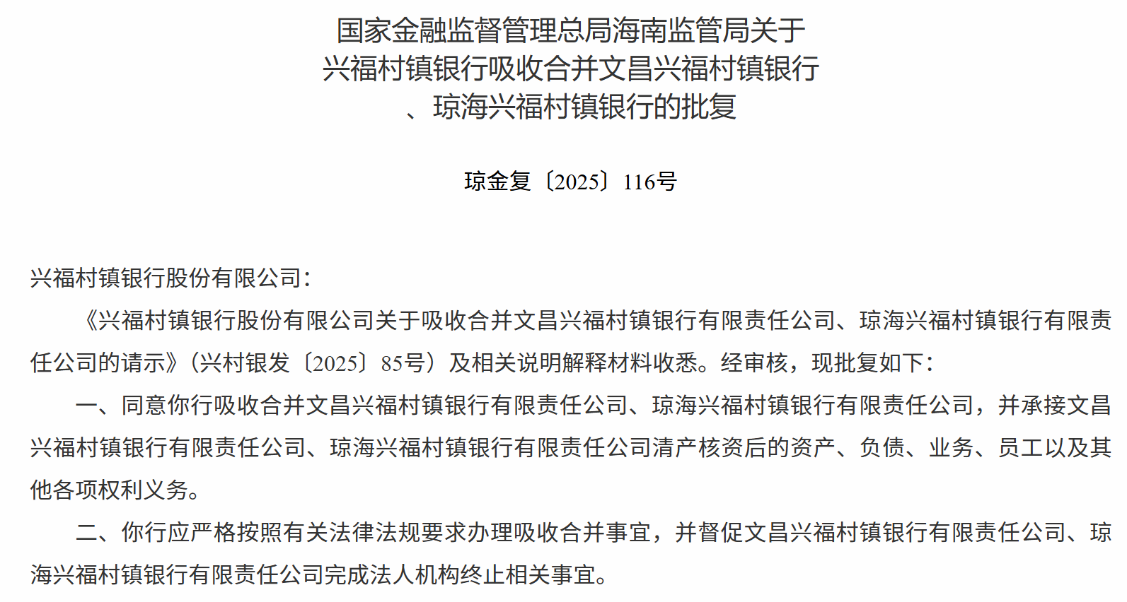 12月10日,国家金融监督管理总局海南监管局发布关于兴福村镇银行吸收合并文昌兴福村镇银行、琼海兴福村镇银行的批复,同意兴福村镇银行吸收合并文昌兴福村镇银行有限责任公司、琼海兴福村镇银行有限责任公司,并承接文昌兴福村镇银行有限责任公司、琼海兴福村镇银行有限责任公司清产核资后的资产、负债、业务、员工以及其他各项权利义务。